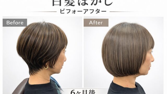 与野本町の美容室で実際のお客様が白髪ぼかしを6ヶ月続けた結果をご紹介。白髪30〜50%のお客様の変化、色落ち、来店周期まで美容師目線で解説します。